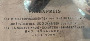 Sehr geehrte Damen und Herren, Anfang der 1950er Jahre gab es einen Schießwettbewerb des Landes Rheinland Pfalz in Bad Hönningen. Mein Vater (..), hat damals den Ehrenpreis des Landes Rheinland-Pfalz gewonnen. Es handelt sich um eine versilbertes Set Kaffekanne, Zuckerdos und Milchkännchen mit graviertem Tablett (Ehrenpreis....).. Mein Bruder, der auch Schützenbruder bei den Sebastianus Schützen in Köln-Rath-Heumar war, ist leider verstorben. Ich selbst (80 Jahre) bin jezt in ein Seniorensitft - mit begrenztem Wohnraum - umgezogen.. Es täte mir zu leid, dass Service zu verramschen, weil es wirklich ein Hingucker ist und würde es gerne zum Ursprung zurückgeben. Mit freundlichen Grüßen